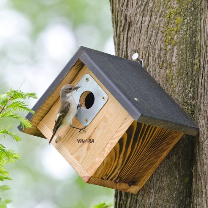 This 32mm hole wooden nest box will be used by Great Tits, Pied Flycatchers, Tree Sparrows and House Sparrows.
