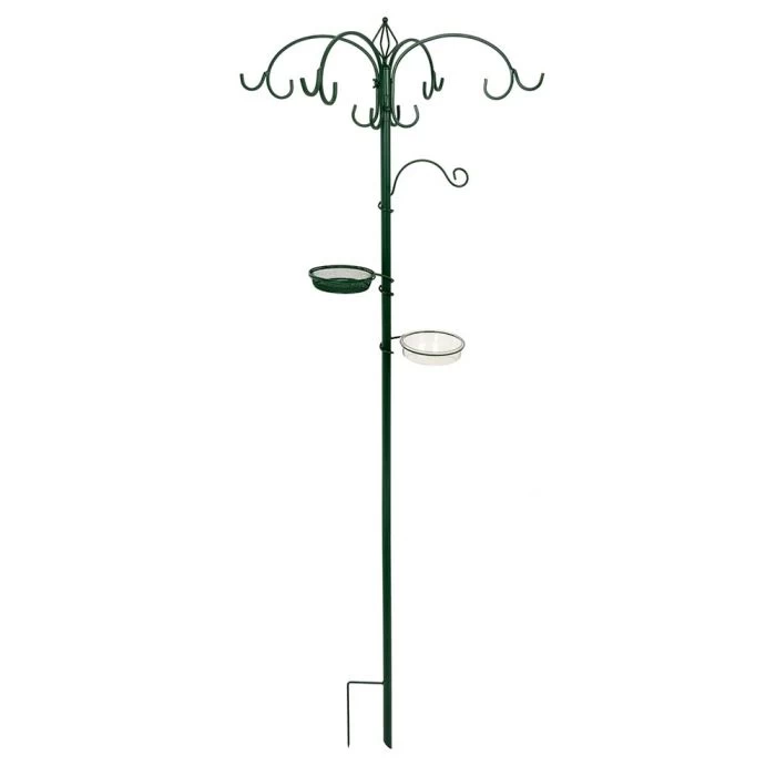 This feeding systemΒ consists of 4 armsΒ with 2 hooks at theΒ end of each arm toΒ hang different typesΒ of feeders. LowerΒ on the pole youΒ can attach an extraΒ hook to offer smallerΒ treats as well asΒ another two dishes.Β One dish is suitableΒ for offering a feedΒ mix or mealwormsΒ and the other dish isΒ for water.