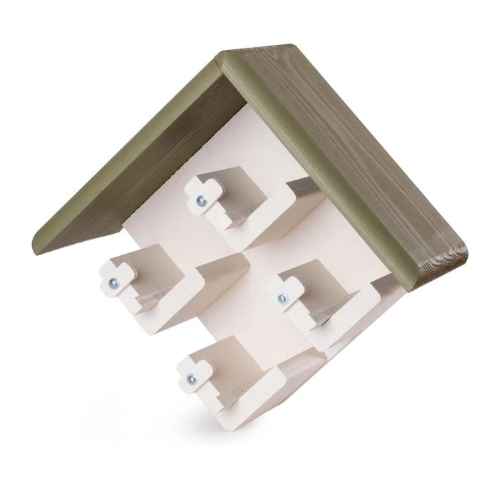 Give this modern wooden feeder a place on your wall, tree or fence. Simply remove the peanut butter lid from the jar and slide it under the roof into the holder. Secure the jar with the slider.