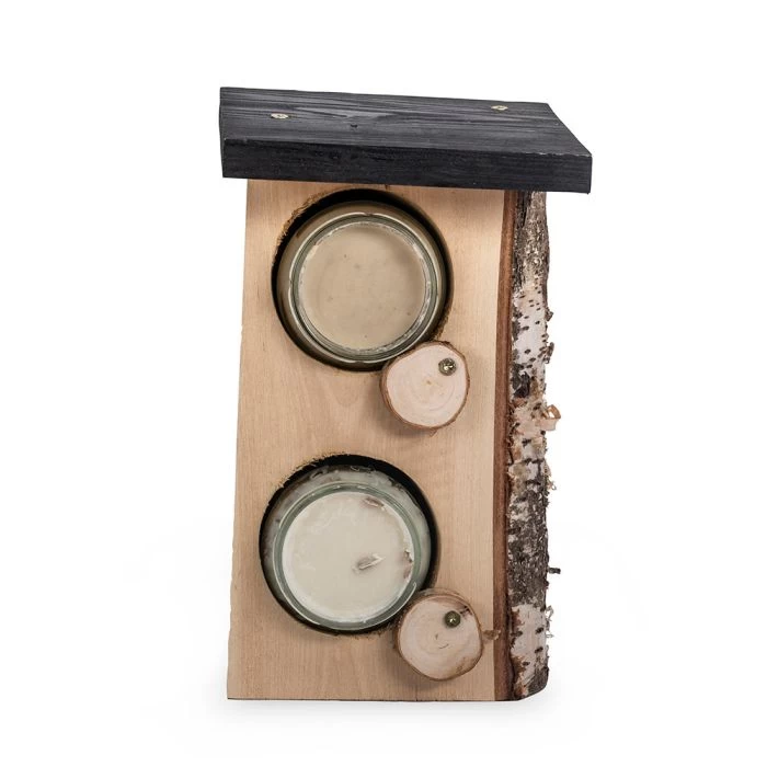 The Quebec double peanut butter jar feeder is made from birch with a plain black roof to finish.