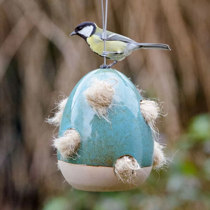 Birds work hard to find suitable nesting materials to make warm, safe nests for their young. This beautiful ceramic nesting wool holder is a convenient way of providing materials such as our Organic Nesting Wool or other suitable material, such as hair from grooming pets.
